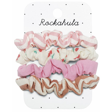 A pack of Rockahula's sweet and wearable scrunchies, each in a different beautiful fabric. Featuring Rockahula's gorgeous cherry print, a soft solid pink and brown and pink candy-striped fabric- these are the perfect scrunchies for autumnal adventures.