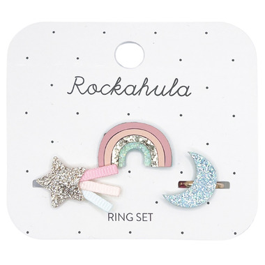Shimmer and shine with this glittering set of three rings, including a pretty pastel rainbow, an opalescent moon and a gold glitter shooting star. Each ring is also adjustable for little fingers. Matching necklace, bracelet set, wand, hair clips and ponies also available. Not suitable for children under 36 months due to small parts.