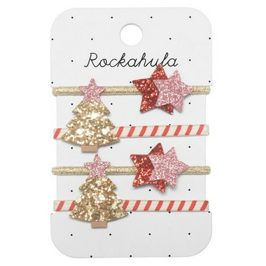 Sparkle your way through the Christmas season in these super fun ponies! This pack of four ponies include two chunky gold Christmas trees with pink star toppers and two sets of bright glitter stars. All adorned on gold or red and cream striped elastics! Wear them one at a time, or all together!