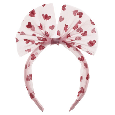 Fall in love with this stunning tulle bow headband, pretty pink tulle adorned with glitter hearts to make your heart flutter! The headband is designed to provide a comfortable fit for little heads. A must have valentines accessory!