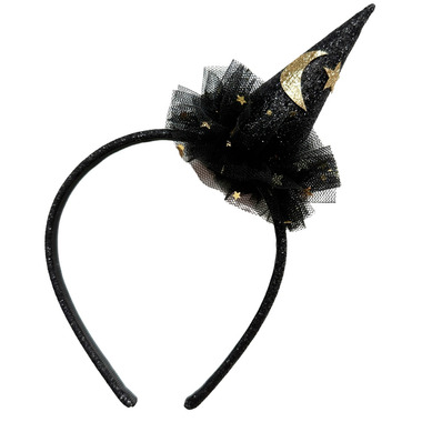 Celebrate the spookiest night of the year and look the part! This mini witches hat is made from black fabric and features a gold glitter moon and star, with gold star studded tulle ruffle detailing. Set onto a sparkling black glitter band, this headband is designed to provide a comfortable fit for little heads.