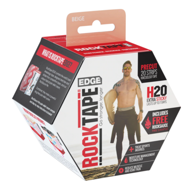 Featuring Moisture Managment Technology, H2O adhesive and RockSauce Fire RockTape Edge takes you to the edge of perfomance When applied properly, RockTape kinesiology tape microscopically lifts the skin away from the muscle and fascia below, increasing blood flow, which relieves swelling, delays fatigue, and increases kinesthetic awareness Stickier: stays on longer than the competition Stretchier: better range of motion, with 180% elasticity, compared to other brands offering 130-150% stretch. Each roll contains 20, 10" strips.