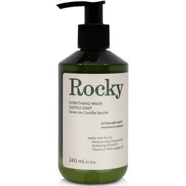 Rockys all-natural Everything Wash is more than just a hand and body wash. This versatile Castile liquid soap in this new Rosemary Mint scent can help clean your whole home and so much more. Made with moisturizing organic coconut, olive, and jojoba oils, this gentle formula removes dirt and impurities without stripping your skin of its natural oils. Lather up and breathe in the invigorating blend of balancing rosemary and bright peppermint.