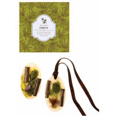 Rosy Rings Forest Oval Sachets have a fragrance with hints of citron, golden raspberry and shaved ginger submerged into a deep woodsy-green base of clary sage, falling leaves, Scotch pine, creamy sandal, red cedar and white musk.