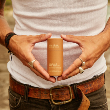 Routine's Reuben & The Desert- now in STICK format! Cardboard on the outside, 100% post consumer recycled plastic in the inside.