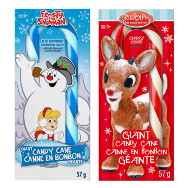 Rudolph the Red Nose Reindeer and Frosty the Snowman Giant Candy Canes in Cherry and Blue Raspberry flavour. Assorted, customers will receive one at random.