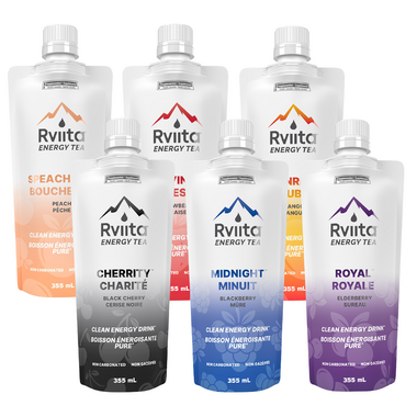 Rviita Energy Tea Divine Strawberry - Filtered Water / Juice from concentrate/ Organic Honey/ Brewed Tea/ Citric Acid / Vitamin blend extract. Rviita Energy Tea Midnight Blackberry - Filtered Water / Juice from concentrate/ Organic Honey/ Brewed Tea/ Citric Acid / Vitamin blend extract/ Guarana seed extract and caffeine.nd extract/ Guarana seed extract and caffeine. Rviita Energy Tea Speachless Peach Green Tea - Filtered Water / Juice from concentrate/ Organic Honey/ Brewed Tea/ Citric Acid / Vitamin blend extract/ Guarana seed extract and caffeine. Rviita Energy Tea Royal Elderberry - Filtered Water / Juice from concentrate/ Organic Honey/ Brewed Tea/ Citric Acid / Vitamin blend extract/ Guarana seed extract and caffeine. Rviita Energy Tea Cherrity Black Cherry -Filtered water, black cherry juice from concentrate, organic honey, natural flavours, brewed tea, citric acid, black tea extract, vitamin blend (vitamin C, niacin, vitamin B12), guarana seed extract, caffeine. Rviita Energy Tea Sunrise Mango Green Tea- Filtered water, Sugars (mango juice from concentrate, organic honey), Natural flavours, Brewed tea, Malic acid, Green tea extract, Vitamin blend (vitamin C, niacin, vitamin B12), Guarana seed extract.