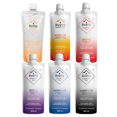 Rviita Energy Tea Divine Strawberry - Filtered Water / Juice from concentrate/ Organic Honey/ Brewed Tea/ Citric Acid / Vitamin blend extract. Rviita Energy Tea Midnight Blackberry - Filtered Water / Juice from concentrate/ Organic Honey/ Brewed Tea/ Citric Acid / Vitamin blend extract/ Guarana seed extract and caffeine.nd extract/ Guarana seed extract and caffeine. Rviita Energy Tea Speachless Peach Green Tea - Filtered Water / Juice from concentrate/ Organic Honey/ Brewed Tea/ Citric Acid / Vitamin blend extract/ Guarana seed extract and caffeine. Rviita Energy Tea Royal Elderberry - Filtered Water / Juice from concentrate/ Organic Honey/ Brewed Tea/ Citric Acid / Vitamin blend extract/ Guarana seed extract and caffeine. Rviita Energy Tea Cherrity Black Cherry -Filtered water, black cherry juice from concentrate, organic honey, natural flavours, brewed tea, citric acid, black tea extract, vitamin blend (vitamin C, niacin, vitamin B12), guarana seed extract, caffeine. Rviita Energy Tea Sunrise Mango Green Tea- Filtered water, Sugars (mango juice from concentrate, organic honey), Natural flavours, Brewed tea, Malic acid, Green tea extract, Vitamin blend (vitamin C, niacin, vitamin B12), Guarana seed extract.