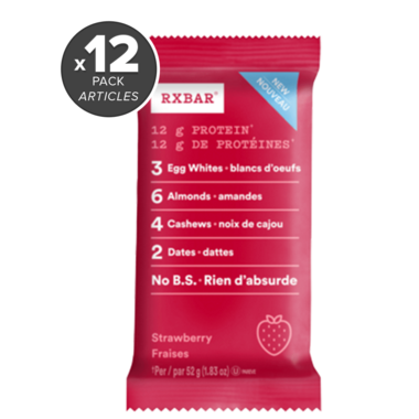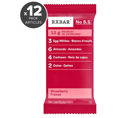 RXBAR Strawberry protein bar has 12 g of protein and no added sugar. Made with real strawberries, egg whites for protein, dates to bind, and nuts for texture. Each bite is made with strawberry goodness you will love.