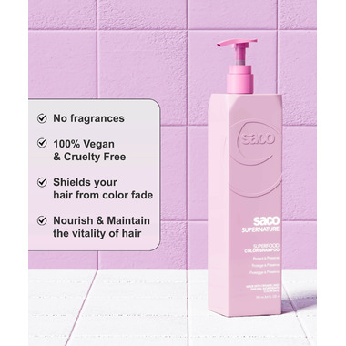 Directions: Apply to wet hair, lather small amount in the palms and massage into hair and scalp, leave the lather for two minutes then rinse thoroughly. For optimal benefits follow with the Saco Color Conditioner.