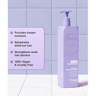 Directions: Apply to wet hair, lather small amount in the palms and massage into hair and scalp, leave the lather for two minutes then rinse thoroughly. For optimal benefits follow with the Saco Hydrating Conditioner. Perfect for dry, coarse or brittle hair.
