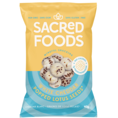 Sacred Foods White Cheddar Popped Lotus Seeds. Mindful Snacking. Only 260 calories and 7g of protein!