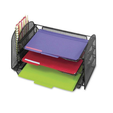 Mesh Desk Organizer features sliding letter trays to use as innovative in/out boxes for letter-size documents. The left side of the desk organizer has an upright compartment to stand file folders and slender binders for easy access. The bottom letter tray can be removed and replaced with Safco's Onyx Mesh Drawer Organizer (sold separately).