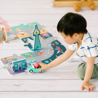 Sago Mini Puzzle Mats combine classic foam mats with the fun of customization. With 12 different tiles featuring beautiful Sago Mini art, kids can make different towns and roadways to create their stories. With the included Robin figurine and a sleek roadster, you're always ready to hit the road. Just like all of their packaging, there's a surprise inside! The box transforms into a cardboard car to take your plushies out for a spin.