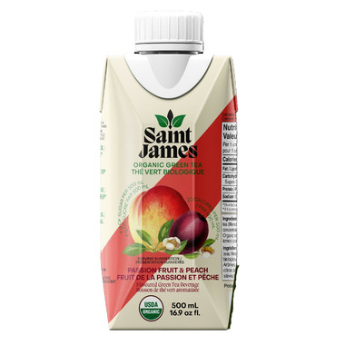 Passionfruit & Peach Green Tea Per 500mL ֖ 20 Calories, 0 Fat, 5g Carbohydrate, 4g Cane Sugar, 0 Protein, 15mg Sodium Ingredients: organic brewed green tea, organic cane sugar, organic natural flavours, organic lemon juice, organic stevia leaf extract. Contains 1% juice.