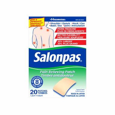 Salonpas Pain Relieving Patch The best-selling OTC pain patch is now new and improved* Salonpas Pain Relieving Patch now includes more pain-fighting medicine in every patch, 20% larger patches, and better flexibility. The patch also features improved adhesion with rounded corners that resist peeling. Salonpas Pain Relieving Patches can be worn for up to 8 hours for comfortable, convenient, and effective pain relief. They are versatile enough for use on the shoulders, neck, back, feet, calves, and joints, staying securely in place while remaining easy to remove. The patch you know and love, improved. *vs. original Salonpas Pain Relieving Patch