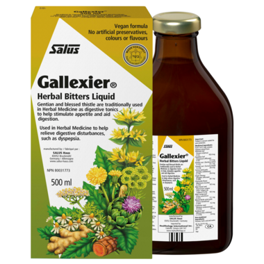 Gallexier Herbal Bitters help to ease the uncomfortable symptoms of indigestion, and helps the liver digest fatty foods by stimulating bile flow. This 12-herb formula also helps to relieve nausea. Suitable for vegetarians and vegans, Gallexier® Herbal Bitters are free of chemical preservatives, additives, gluten, wheat, yeast, dairy, lactose, alcohol and GMO-sourced ingredients.
