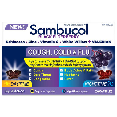 These day and night Liquid Action capsules provide multi-symptom cough, cold and flu relief. Sambucol Cough, Cold and Flu capsules include a unique combination of effective natural & flu fighting ingredients including Echinacea, Zinc, Vitamin C, White Willow, and Valerian. Take Sambucol daily to boost your immunity and increase your dose at the first sign of cough, cold, and flu symptoms for best results.