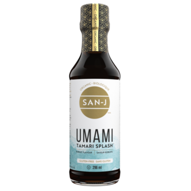 San-J Umami Tamari Splash is packed with umami from ingredients with rich flavors such as San-J Tamari, red miso, black garlic, kombu, shiitake, and tomato.