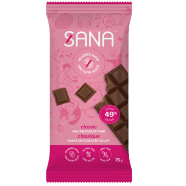 SANA's milk chocolaty classic bar has no added sugar and 49% cocoa.