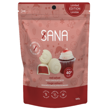 SANA's red velvet flavoured white chocolaty bites have no added sugar and 40% cocoa.