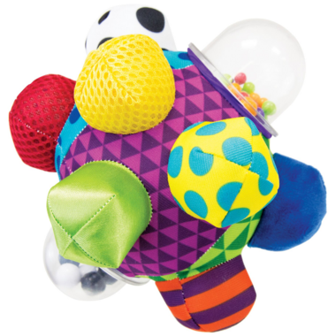 The bright colors, bold patterns and easy-to-grasp bumps make this ball a must-have. The high contrast colors of the ball allow baby to focus, strengthening vision. The gentle rattle sounds from the trapped beads create neural connections in baby’s brains from birth through 3 years of age. Chunky sized bumps on the ball encourage reaching, grasping, and transferring from one hand to another, developing baby’s motor skills. The differing materials engage baby’s developing tactile sensitivity and teach baby about variety.