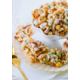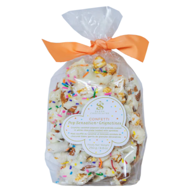 A burst of flavour in each bite! Enjoy this crunchy caramel corn coated in white chocolate, loaded with crunchy pretzels that are topped with rainbow sprinkles and white mini pearls. This delicious mix of sweet and salty will be hard to share!