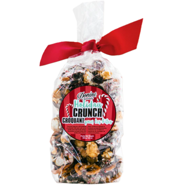 Delicious caramel corn lathered with white peppermint infused chocolate, crushed candy canes and crunchy pretzels.
