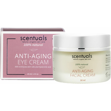 Scentuals rich silky 100% natural Anti-Aging Eye Cream delivers long lasting hydration. Crafted with Echinacea stem cells and Hyaluronic acid to nourish and clarify the sensitive skin around eyes. Mango Seed butter minimizes fine lines and wrinkles, while Chamomile oil diminishes puffiness.