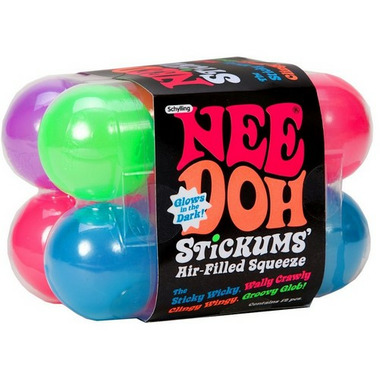 NeeDoh Stickums give you glowy, squishy fun in day or night! Stickums is a pack of 12 small groovy globs in an exciting assortment of glow-in-the-dark colours. A light air fill and sticky skin allows you to not just give them a good squeeze, squish, pull, or smush; you can throw it on a wall, window, or any flat surface to watch the groovy roll down and around. Good for ages 3+.
