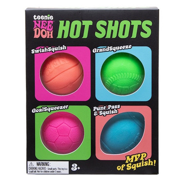 Bring the squish to the field with Teenie NeeDoh Hot Shots. These four balls are teenie in size, but big in fun with shapes and textures that look and feel like a mini basketball, softball/baseball, soccer ball, and football. Share with friends and be the MVP of squish!