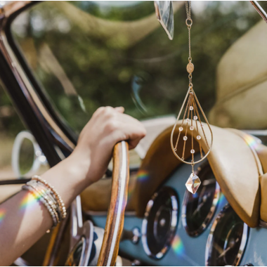 Captured sunlight transforms into beautiful rainbows that spread joy. Crafted from brass, semi precious gemstones and crystal.
