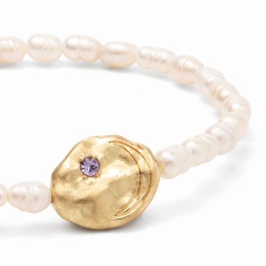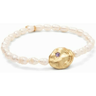 - Natural rice pearls are intertwined with organically shaped medallions on each bracelet
