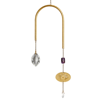 Captured sunlight transforms into beautiful rainbows that spread joy. Crafted from brass, semi precious gemstones and crystal.
