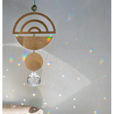 Captured sunlight transforms into beautiful rainbows that spread joy. Crafted from brass, semi precious gemstones and crystal.
