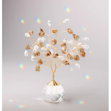 Made of semi-precious gemstones, faceted crystal, & brass.