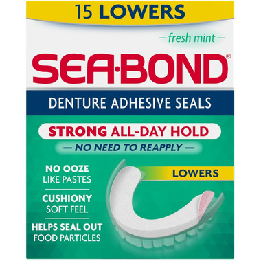 Best holding Sea-Bond ever. Guaranteed to hold comfortably all day without the ooze and mess of pastes. And unlike pastes, clean-up is fast and easy. Sea-Bond has 3 powerful adhesives that create an all day bond between your gums and your dentures. One side is now coloured...showing the extra layer of holding adhesive. Keeps breath odour-free too, with dentsyn. Plus, natural fresh mint for a clean mouth feel.