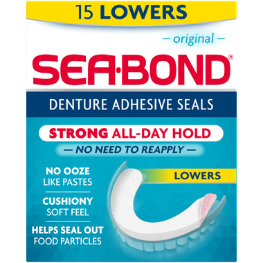 Sea-Bond Denture Adhesive is not a paste or a powder, but a thin wafer seal with three powerful adhesives that holds dentures in place all day without the ooze and mess of pastes. Available in Original (Flavor Free) and Fresh Mint varieties.