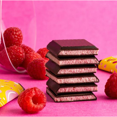 Pink bubbly raspberry chocolate truffle bar with candies that pop!