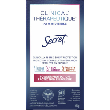 Never let them see you sweat! Secret Clinical Strength Antiperspirant and Deodorant for Women is clinically proven protection for 3 types of sweat; 1) stress sweat, 2) heat sweat and 3) activity sweat.