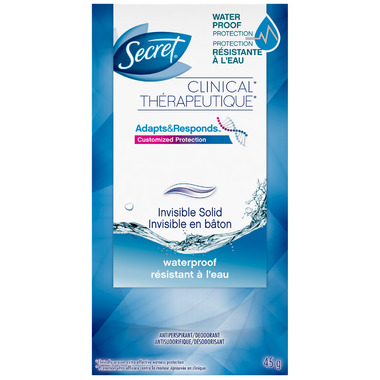Secret Clinical* has Adapts & Responds Technology that senses your sweat levels throughout the day, adapting the level of protection, and helps to stop odour before it starts. Secret Clinical* Invisible Solid—incredible protection, no matter what the day may bring.