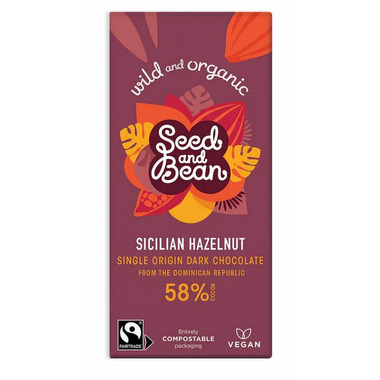 Sicilian hazelnut single origin dark chocolate from the Dominican Republic. Entirely compostable packaging and 58% cocoa.