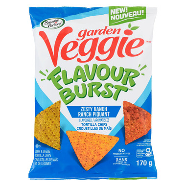 Get ready for a taste bud adventure like no other with Garden Veggie™ Flavour Burst™ Tortilla Chips. These chips are a flavor-packed rollercoaster with an explosion of Zesty Ranch. Made with a delicious blend of corn and vibrant veggies that the whole family can enjoy. Brace yourself for a burst of flavour and craveable crunch. Will you be team green, team orange, or team red? Flavour. Bursting. CRUNCH.