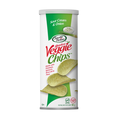 Sour cream & onion veggie chips made with potatoes, spinach, broccoli and peas.