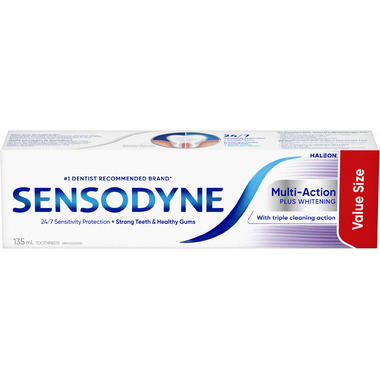 Sensodyne Multi-Action toothpaste relieves sensitive teeth with twice daily brushing and builds soothing protection inside the tooth. It also helps prevent cavities and helps fight tartar build-up, while its great taste leaves a fresh, clean feeling in your mouth.