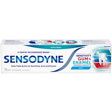 Sensodyne Sensitivity Gum and Enamel Toothpaste is a flavored triple-action formula toothpaste that provides long-lasting, clinically proven sensitivity relief and helps restore gum health. It also rehardens the enamel when used twice daily for strong and healthy teeth and gums.