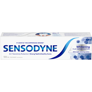 Exposed areas of porous dentin can be prone to sensitivity. With fluoride to help prevent tooth decay, this low-abrasion toothpaste is formulated to gently yet effectively remove stains, helping restore teeth to their natural whiteness. Sensodyne Whitening Plus Tartar Fighting toothpaste effectively prevents tartar build-up and reduces its yellowing effect - helping restore your teeth to their natural whiteness, while twice-daily brushing will help prevent tooth sensitivity.