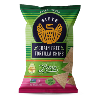 Siete Grain Free Tortilla Chips are made with 100% avocado oil and are gluten free, vegan and non-GMO project verified.