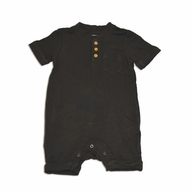 Short-sleeved romper suit in buttery soft bamboo rayon jersey in solid color. Buttons at front and concealed snap fasteners at gusset and along legs.