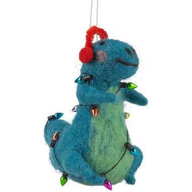 Whimsical felt dinosaur ornament, glowing with tiny twinkling light string to bring a prehistoric sparkle to your holiday decor.